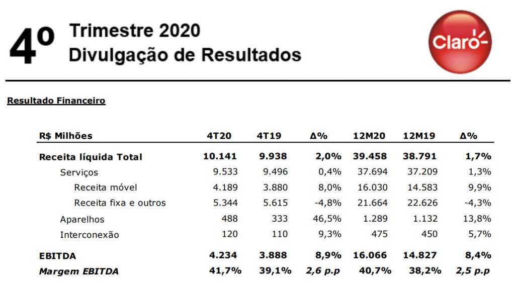 Durante apresentação de resultados na noite desta terça-feira, 9, a Claro informou ao mercado que atingiu um faturamento de R$ 10,1 bilhões no quatro trimestre de 2020, acumulando durante o ano a receita total de R$ 39,5 bilhões, crescimento de 1,7% em relação ao ano anterior.