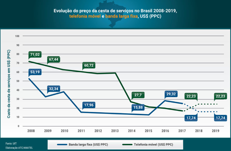 A partir da análise dos dados da União Internacional de Telecomunicações (UIT), a Anatel verificou que o Brasil passou da 83ª posição em 2018 para a 63ª em 2019 no ranking mundial de preços na telefonia móvel.