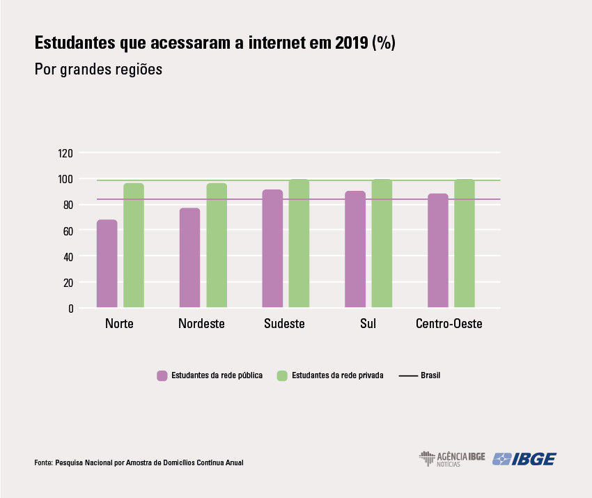 Entretanto, as regiões Norte e Nordeste apresentaram o menor percentual de alunos conectados, 68,4% e 77,0%, respectivamente.
