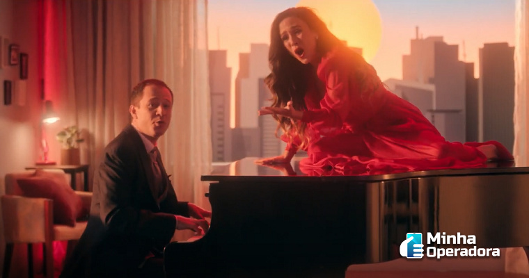 No novo filme, Tiago toca piano enquanto Tatá canta e performa em vários cenários com um grupo de dançarinos portando celulares e notebooks. “Com a Claro eu sou muito mais”, cantam eles.