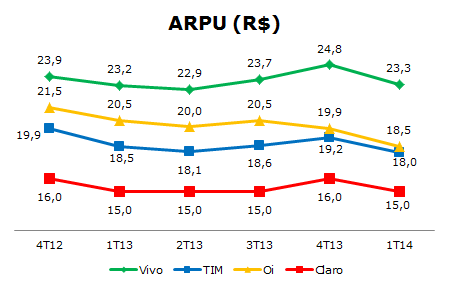 Os valores de ARPU informados pelas operadoras não são totalmente comparáveis por utilizarem critérios diferentes na sua determinação: