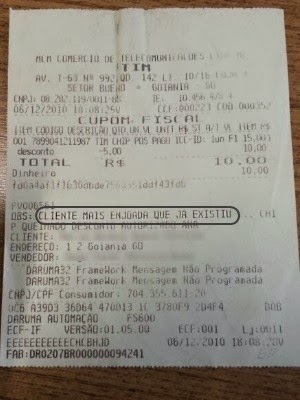 Virou moda agora? Depois do caso “Otário Chorão“, apareceu mais essa. Uma cliente da TIM ganhou na Justiça o direito a uma indenização por danos morais no valor de R$ 6.780, após ser identificada em um cupom fiscal como “a cliente mais enjoada que já existiu”. A decisão foi do juiz do 10º Juizado Especial Cível de Goiânia, Fernando Mello Xavier. A sentença foi dada no último dia 14. Cabe recurso da decisão.