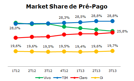 A perda em market share da Vivo ocorre no segmento pré-pago devido à adoção de um critério de desligamento mais restritivo que as demais operadoras e um esforço de migração de sua base para o pós-pago. Mantidas as tendências atuais, a Vivo pode ser ultrapassada pela Claro em market share de pré-pago ainda este ano.