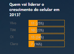 Como se pode ver, a Oi aparece com apenas 6.3% dos votos, sendo a menos votada na enquete, apesar de ter lançado várias ofertas tanto no segmento pós-pago (desconto em aparelhos), quanto no segmento pré-pago (promoção Tudo por Dia). Claro e TIM não apresentaram grandes novidades para o mercado, apenas reforçaram a presença na mídia, como a campanha ‘É outra coisa’ no caso da Claro.