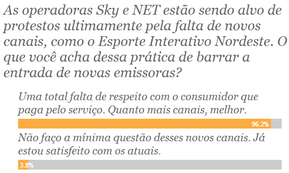 “O que Sky e Net estão fazendo é uma total falta de respeito com o consumidor que paga caro pelos seus serviços”. Foi isso o que os leitores do Minha Operadora tentaram dizer ao votar na enquete da semana passada (19-25/01). Confira o resultado abaixo: