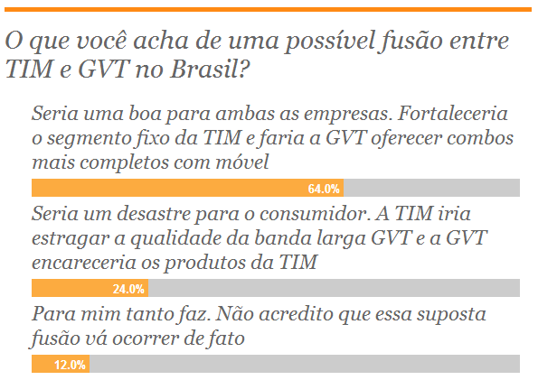 Os consumidores brasileiros estão ansiosos e na torcida por uma união das empresas TIM e GVT. Essa possibilidade já vem sendo cogitada há algum tempo e aproveitando o momento de fusões e aquisições recorrente no mercado de telecomunicações brasileiro o Minha Operadora produziu uma enquete na semana passada (09-15/02) e essa enquete finalizou com 64% dos votantes achando uma boa tanto para a GVT quanto para a TIM. Confir abaixo o resultado detalhado: