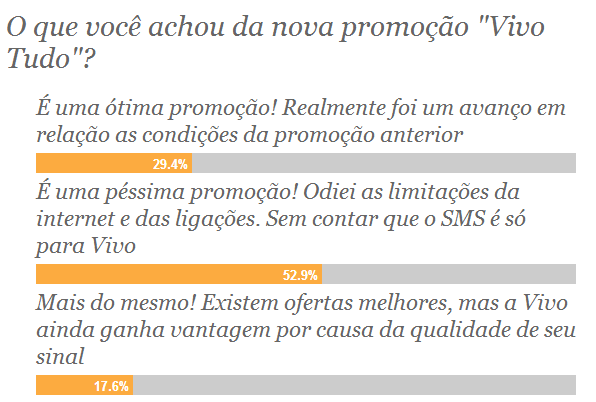 A promoção Vivo Tudo não surpreendeu os visitantes do Minha Operadora. Pelo contrário, os votantes na enquete da semana passada (26/01-01/02) odiaram as tantas limitações que a operadora impõe tanto para efetuar ligações em algumas regiões, quanto a franquia e velocidade da internet, que ao ser reduzida chega a míseros 16 kbps. Além disso, o envio de torpedos continua sendo restrito a celulares Vivo, coisa que na concorrência existem mensagens disponíveis para celulares de outras empresas.