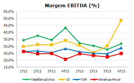 A Oi liderou em margem EBITDA no trimestre devido a Inclusão da receita da venda da Globenet no calculo de seu EBITDA. Sem esta receita, sua margem EBITDA de rotina seria de 27,7%.