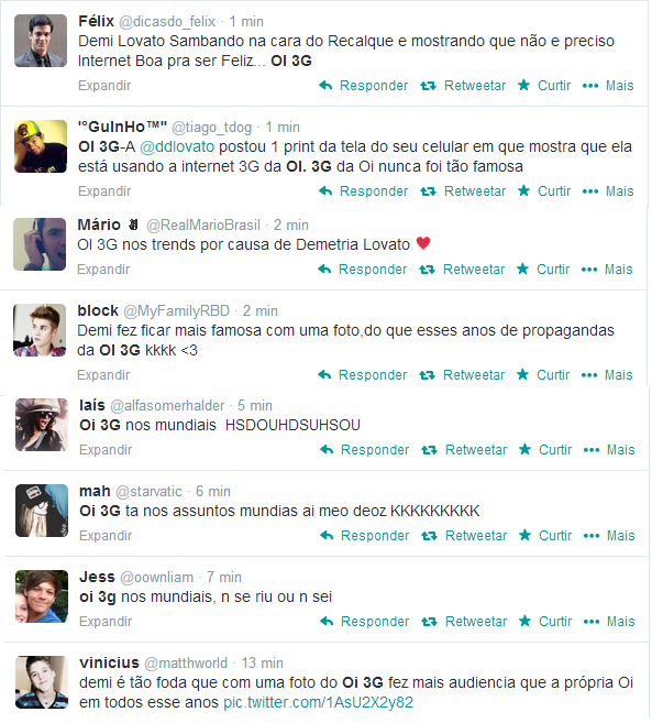 A cantora americana Demi Lovato está no Brasil para a sua turnê “The Neon Lights Tour América do Sul”. Só que junto com a hashtag da turnê #NEONLIGHTSTOURSA estava “OI 3G” como os assuntos mais comentados tanto no Brasil como entre os tweets mundiais.
