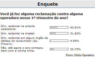 Dos que votaram na enquete da semana passada (30/03 – 05/04) um total de 77,28% já formularam uma queixa no primeiro trimestre deste ano. Desse percentual, 40,91% reclamaram na própria operadora; 31,82% reclamaram na Agência Nacional de Telecomunicações (Anatel) e outros 4,55% queixaram-se no Procon de seu estado.