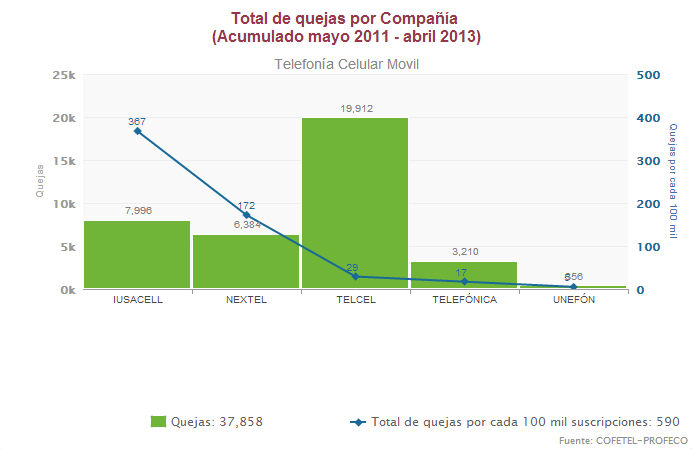 Existe também um programa bastante parecido com o realizado no Brasil que mede a qualidade do serviço móvel dos usuários. São feitas medições aleatórias do serviço prestado de voz, SMS e internet móvel. O IFT – Instituto Federal de Telecomunicaciones – também elaborou o projeto “IFT por mi” em que os usuários tem um espaço para reclamar do serviço prestado a ele. Tivemos acesso a dados de 2011 (quando o projeto foi criado) até o ínicio do 2º trimestre de 2013 e é possível ver que a Telcel lidera também com folga nas reclamações. Veja o gráfico: