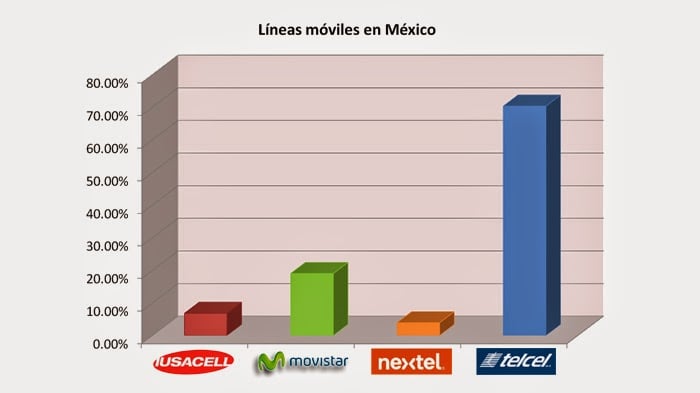 O México possui quatro operadoras principais. São elas: Telcel, Movistar, Iusacell e Nextel. Dados do último semestre de 2013 apontam a liderança isolada da Telcel – uma empresa do Grupo América Móvil – com quase 80% do mercado.