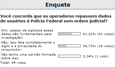 Enquete da última semana de maio perguntou se os visitantes do site concordam que as operadoras devam repassar dados pessoais a polícia.