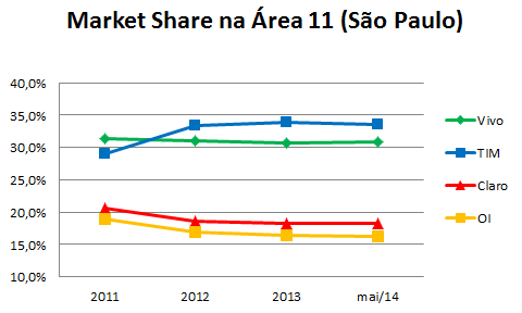 A TIM ultrapassou a Vivo e assumiu a liderança em market share em São Paulo em 2012. A TIM é a líder no pré-pago com 40% de market share em maio de 2014, mas a Vivo continua na liderança no pós-pago com 45,2% de market share.