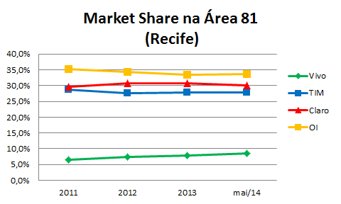 A Vivo se mantém na liderança mas está sendo ameaçada por Oi e TIM. Em maio de 2014 a TIM liderava o pré-pago com 30,7% de market share e a Vivo o pós-pago com 42,4%.
