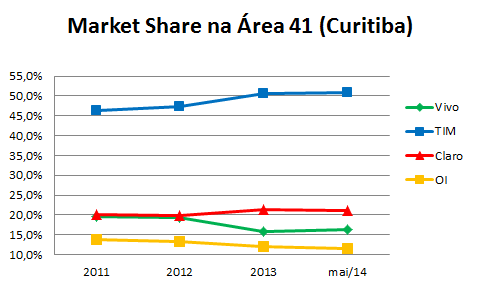 A TIM é a líder absoluta em Curitiba e vem ampliando seu market share. Ela lidera no pré-pago (57,1%) e no pós-pago (35,2%).