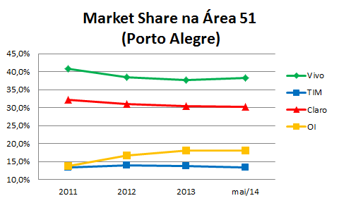 A Vivo lidera com folga na área local de Porto Alegre, com a Claro em segundo e Oi e TIM disputando a 3ª colocação. Ela lidera no pré-pago (34,2%) e no pós-pago (47,9%).