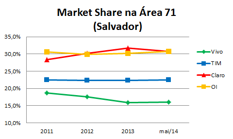 A Claro, com 30,74% de market share em maio de 2014, e a Oi (30,72%) disputam a liderança em Salvador, área local de maior densidade do país (203,3 cel/100 hab.). Claro liderava no pré-pago (32,7%), seguida pela Oi (32,0%), enquanto a Vivo liderava no pós-pago (34,4%).
