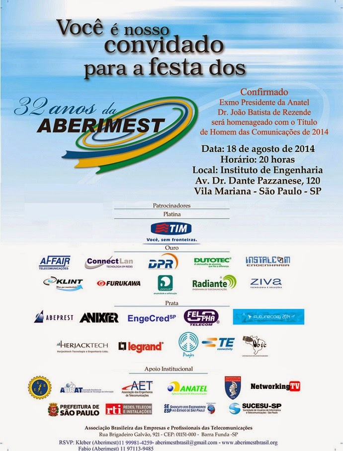 “Parabenizamos a Aberimest pelos 32 anos de atividades e também pela feliz escolha de João Batista de Rezende como Homem das Comunicações 2014. Rezende tem conduzido a Anatel com maestria e visão de futuro, atuando com ética e firmeza de propósitos. Com certeza, é um homem merecedor de tal honraria.”