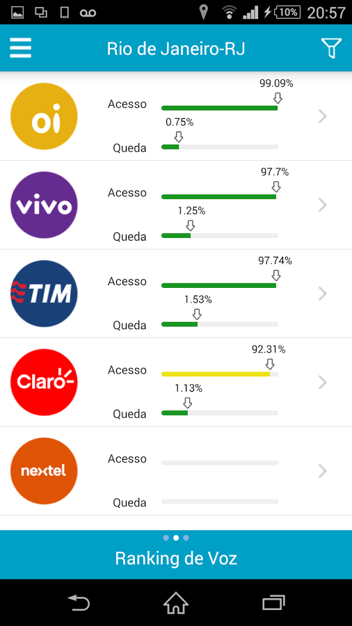 A referência para o indicador de queda da rede de voz é de 2% ou inferior. A barra de cor verde indica o atingimento do indicador estabelecido. A barra de cor amarela expressa o indicador entre 2,01% e 4,99%. A barra de cor vermelha indica valor igual ou superior a 5%.