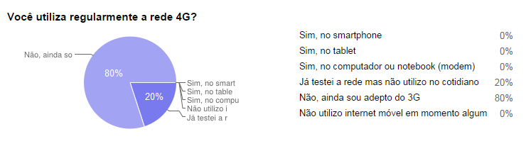 Nenhuma das pessoas que votaram em nossa enquete da semana passada faz uso da tecnologia no dia a dia. Alguns, 20%, já até chegaram a testar a experiência de navegação da internet 4G. Mas a grande massa (80%) ainda estão empacados no 3G.