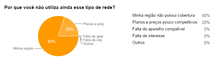 Apesar de uma grande operadora anunciar que já possui antenas emitindo sinais de internet 4G em mais de 100 municípios, a falta de cobertura ainda é a principal responsável pela baixa popularidade dessa tecnologia (80%). Mais até do que os valores cobrados em planos específicos para acessar a rede (20%). Conseguir um aparelho compatível parece já não ser mais um problema.