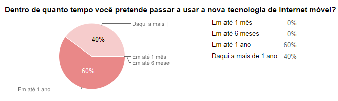 As operadoras vendem a internet 4G como uma rede com velocidade até 10x mais rápida do que a rede 3G. Apesar disso, os nossos leitores não aparentam ter pressa em migrar para a internet móvel de quarta geração. 6 em cada 10 votantes pretendem ter uma internet 4G dentro de até um ano. 4 em cada 10 deles aguardariam até mais de um ano para passar a utilizar a internet de última geração. Isso quer dizer que, apesar de interessante, toda a velocidade oferecida nessa tecnologia não chama tanto a atenção dos brasileiros. Talvez o pensamento muito comum: “se as operadoras não conseguem nem oferecer 3G direito, imagina o 4G”, pode causar um receio no consumidor sobre se a novidade vai atender as suas expectativas ou não.