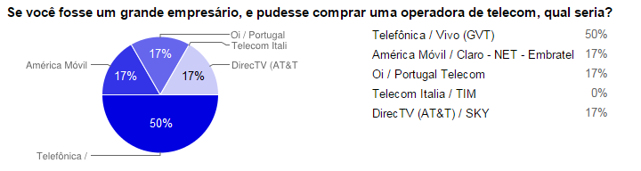 Os grupos América Móvil (detentor da marca Claro, NET e Embratel), Oi (controlador da Portugal Telecom) e SKY (controlado pela DirecTV) ficaram com 17% das intenções de compra dos nossos leitores cada um. Diante das incertezas diante do futuro da TIM Brasil, ninguém pensa em adquirir a operação da operadora.