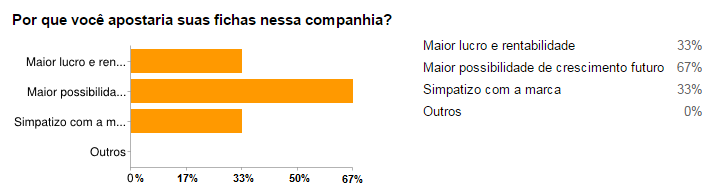 Escolhas feitas. Porém, perguntamos qual o critério utilizado para cada participante ter escolhido sua participada. Para chegar ao Brasil, os nossos investidores imaginários levaram em conta principalmente a maior possibilidade de crescimento futuro da marca, esse fator foi escolhido por 67% dos votantes. Maior lucro e rentabilidade é levado em conta por 33% e a simpatia com a marca é considerada por outros 33%.