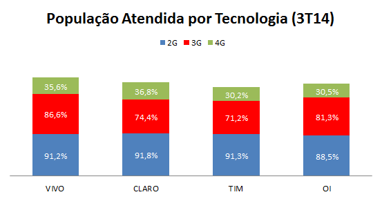 A Vivo era líder em população atendida no 3T14, quando se considera o conjunto das três gerações de tecnologia. Ela liderava em população atendida com 3G (86,6%) e a Claro em população atendida com 2G (91,8%) e 4G (36,8%).