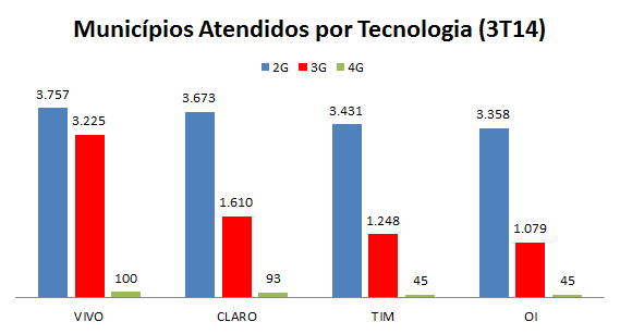 A Vivo liderava também em quantidade de municípios atendidos com 2G, 3G e 4G.