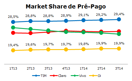 A TIM é a líder em market share de pré-pago e ampliou esta liderança no 3T14.