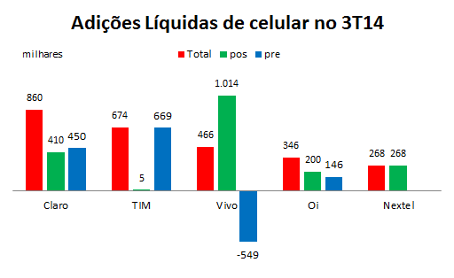 A Claro liderou por ter apresentado um bom desempenho no pós e no pré-pago. A TIM liderou em adições líquidas de pré-pago e a Vivo em adições líquidas de pós-pago.