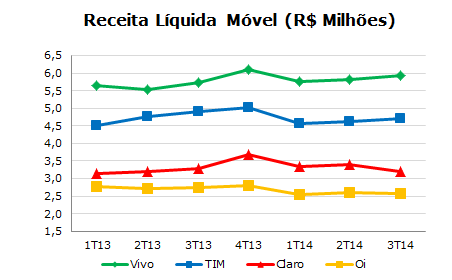 A Vivo se manteve na liderança com uma receita de R$ 5,9 bilhões no 3T14 e crescimento de 3,5% na comparação com o 3T13.