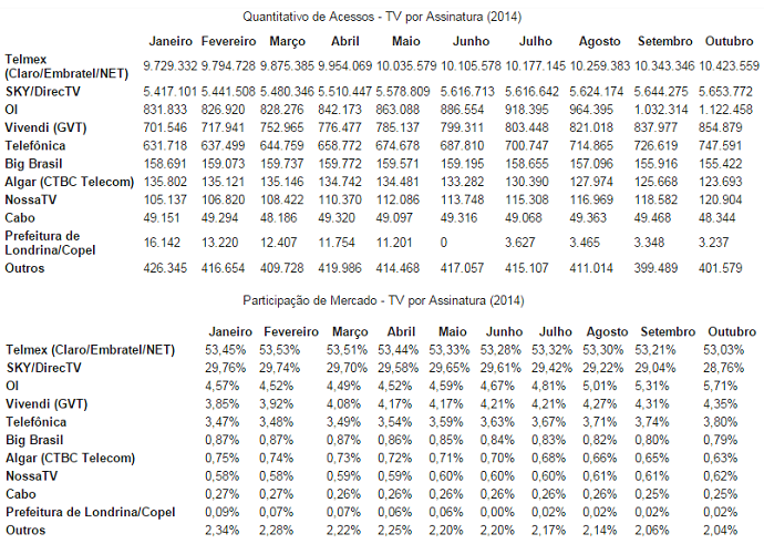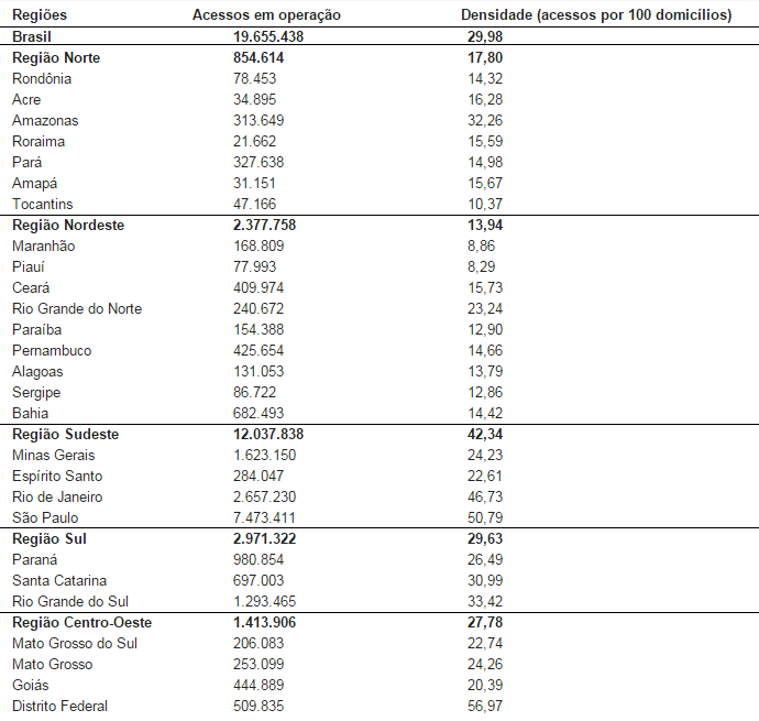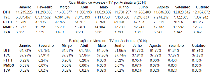 O Brasil fechou outubro de 2014 com 19,65 milhões de acessos de TV paga. No mês, de cada cem domicílios, 29,98 possuíam o serviço, segundo o indicador “Densidade dos Serviços de TV por Assinatura”, que é a relação percentual entre o número de assinaturas e o número de domicílios estimado a partir dos dados publicados pelo IBGE, em sua Síntese de Indicadores Sociais¹. Veja abaixo o número de assinantes e a densidade dos serviços de TV por assinatura em outubro de 2014, por Unidade da Federação e por Região: