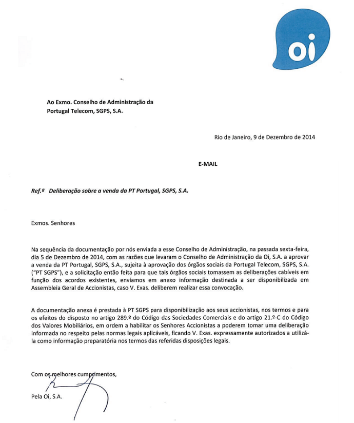 Dentre os tópicos do documento, estão contidas informações detalhadas sobre a proposta de venda da PT pela Oi, incluindo a descrição de e-mails enviados pela operadora brasileira à Portugal com o objetivo de informar sobre as negociações; A combinação de negócios, o aumento de capital da Oi e os Instrumentos da Rio Forte Investments, S.A.; O acordo sobre os termos para prosseguir com a combinação de negócios; A oferta pública de ações oferecida pela empresária angolana Isabel dos Santos; Além dos fatores de risco da operação e algumas advertências. Tudo para que seja tomada uma decisão que seja a melhor para a companhia.