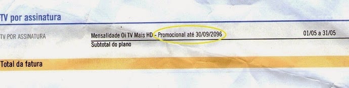 A Oi TV está sendo obrigada pelo 10º Juizado Cível Especial de Goiânia a manter a oferta de uma cliente chamada Joana Ferreira da Costa até 2096. Isso porque a operadora costuma enviar a fatura para os seus clientes informando – provavelmente de forma errônea – que a oferta ativa tem validade até determinado período do ano de 2096.