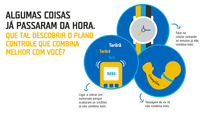 “Algumas coisas já passaram da hora. Que tal descobrir o plano controle que combina melhor com você?” é o apelo da campanha. “Dar uma conferida no WhatsApp até dentro do cinema”, “Correr atrás de um Wi-Fi porque acabaram os créditos”, Navegar nas redes sociais e passar o tempo rindo com os vídeos dos amigos”, “Conquistar um sonho e ligar todo bobo para a mamãe” e “Ficar com a orelha quente de tanto falar no celular” são os questionamentos do simulador. É com base nas respostas (se combina ou não combina) que a TIM diz qual plano controle comercializado por ela combina mais com o consumidor que fez o teste e os seus benefícios e valores.