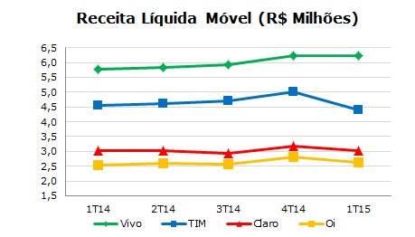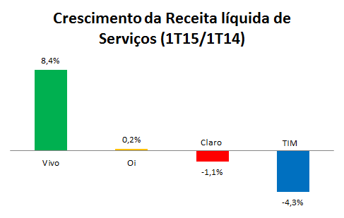 A Vivo liderou o crescimento da receita líquida de serviços no 1T15, tendo sido a única das quatro operadoras a apresentar crescimento superior ao da inflação no período (IPCA= 8,1%).