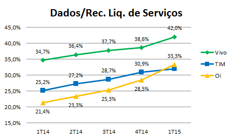 A Vivo é a operadora em que dados representa uma parcela maior de sua receita de serviço.
