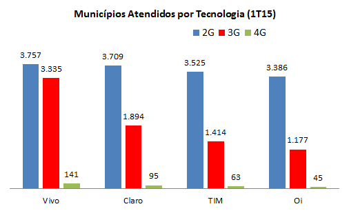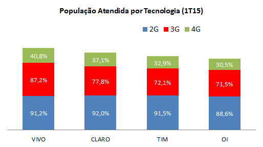 A Vivo era líder em população atendida no 1T15, quando se considera o conjunto das três gerações de tecnologia. Ela liderava em população atendida com 3G (87,1%) e em população com 4G (40,8%). A Claro liderava em população atendida com 2G (92,0%).