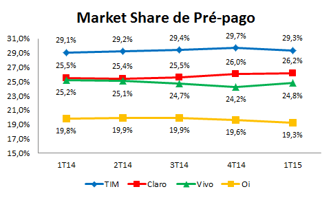 A TIM é a líder em market share de pré-pago, mas perdeu market share no 1T15. Já Vivo e Claro ganharam market share no trimestre.