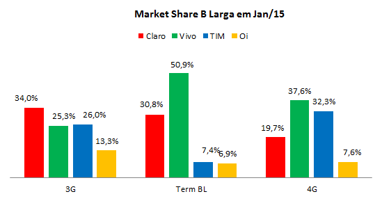 A Claro manteve a liderança em market share de banda larga móvel no Brasil em jan/15, último mês para o qual a Anatel havia divulgado estas informações quando a consultoria Teleco produziu esta análise.