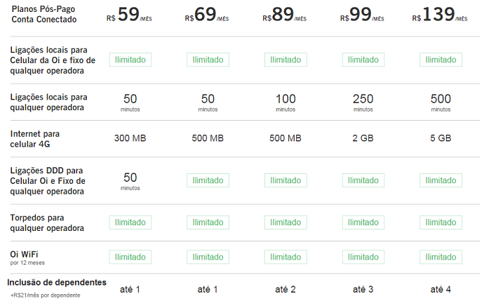 A Oi promoveu mudanças nos preços e benefícios dos seus planos de celular pós-pagos (conta). Até o dia 19 de outubro, os consumidores poderão contratar planos que variam de R$ 49 a R$ 139 por mês. São disponibilizadas ligações locais ilimitadas para celular Oi e Fixo de qualquer operadora em todos os planos; ligações longa distância para celulares Oi e Fixo de qualquer operadora (a partir do plano de R$ 69); minutos para falar com celular de qualquer operadora; acesso à internet 4G; acesso à rede Oi WiFi; envio de torpedos ilimitados para qualquer operadora do Brasil; além da possibilidade de poder compartilhar os benefícios do plano com até quatro dependentes (mediante pagamento de taxas adicionais).