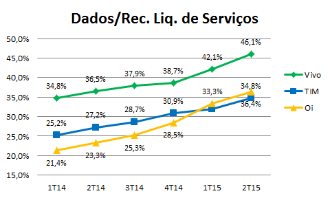 A Vivo é a operadora em que dados representa uma parcela maior de sua receita de serviço.