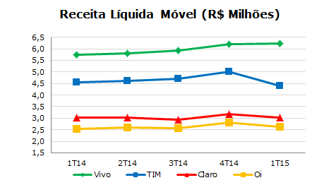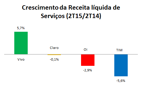 A Vivo liderou o crescimento da receita líquida de serviços no 2T15, tendo sido a única das quatro operadoras a apresentar crescimento positivo.