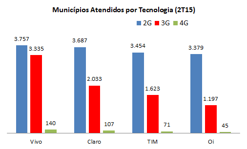 A Vivo liderava também em quantidade de municípios atendidos com 2G, 3G e 4G.