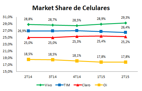 A Vivo, maior operadora de celular do Brasil, terminou o 2º trimestre de 2015 (2T15) com 82,7 milhões de celulares e market share de 29,3%.