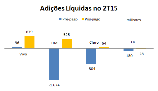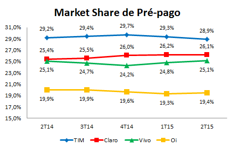 A TIM é a líder em pré-pago, mas perdeu market share no 2T15. Já Vivo e Oi ganharam market share no trimestre.