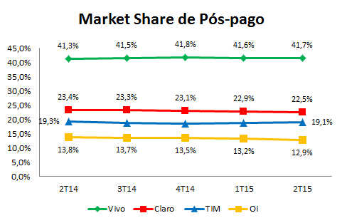A Vivo é a líder no pós-pago e ganhou market share no trimestre, juntamente com TIM e Nextel.